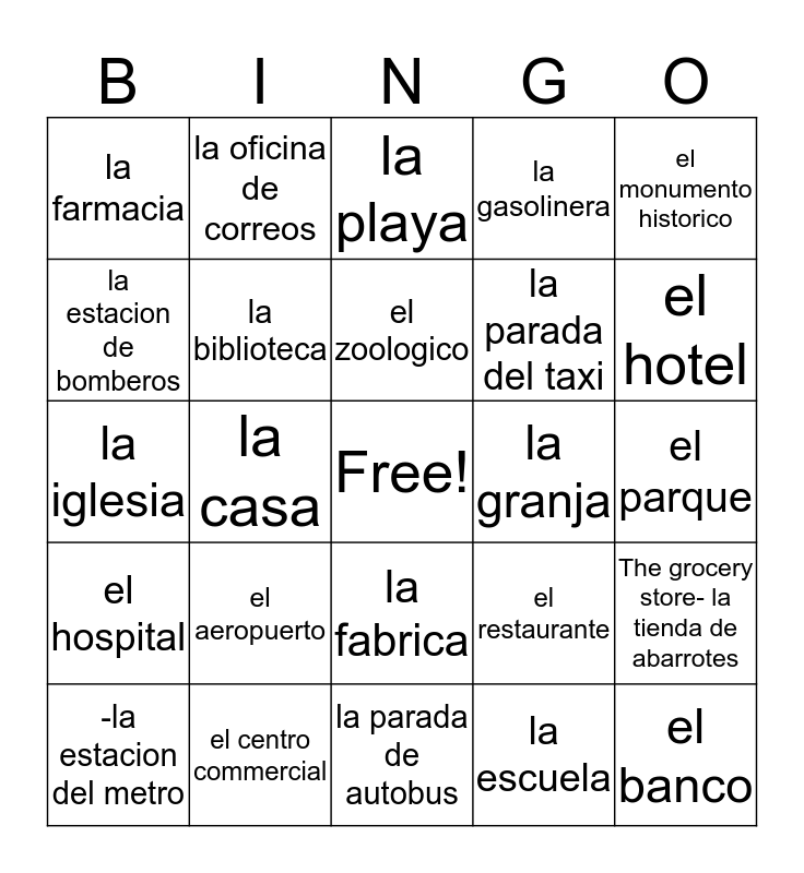 This bingo card has a free space and 27 words: el restaurante, el cine, la parada del taxi, la parada de autobus, la estacion de bomberos, la playa, la oficina de correos, el hospital, la granja, The grocery store- la tienda de abarrotes, la iglesia, la gasolinera, -la estacion del metro, el centro commercial, el hotel, la estacion de policia, la biblioteca, el zoologico, el aeropuerto, la farmacia, el parque, la escuela, la casa, el banco, la fabrica, el monumento historico and el cementerio.