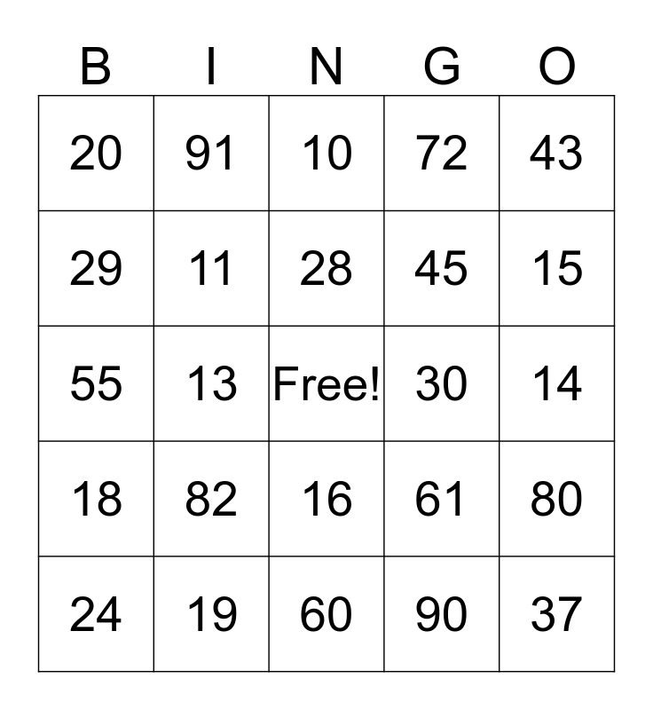 This bingo card has a free space and 29 words: 24, 12, 13, 17, 20, 10, 11, 82, 30, 19, 14, 37, 60, 90, 15, 92, 16, 18, 43, 55, 61, 71, 45, 29, 72, 91, 80, 28 and 31.