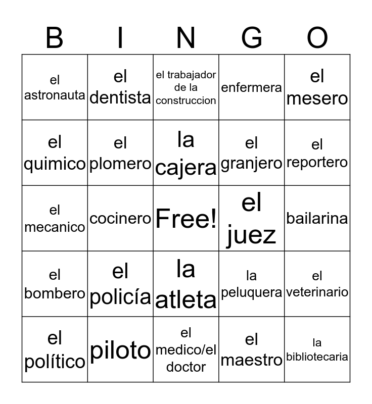 This bingo card has a free space and 27 words: la peluquera, el cartero, el granjero, el medico/el doctor, el quimico, el trabajador de la construccion, el dentista, el bombero, el juez, el veterinario, el mecanico, enfermera, el político, piloto, el reportero, el payaso, el plomero, la cajera, el policía, el astronauta, bailarina, el maestro, cocinero, la bibliotecaria, la atleta, el mesero and la cantante.