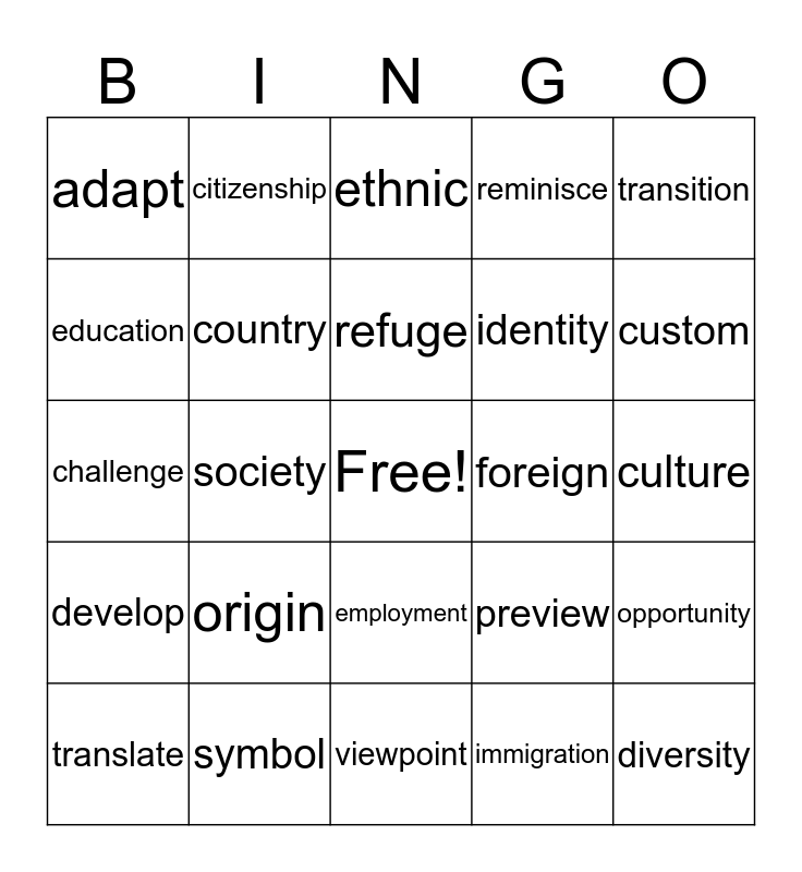 This bingo card has a free space and 24 words: origin, symbol, refuge, translate, transition, adapt, education, citizenship, foreign, employment, identity, challenge, preview, opportunity, country, immigration, culture, ethnic, custom, society, diversity, develop, reminisce and viewpoint.