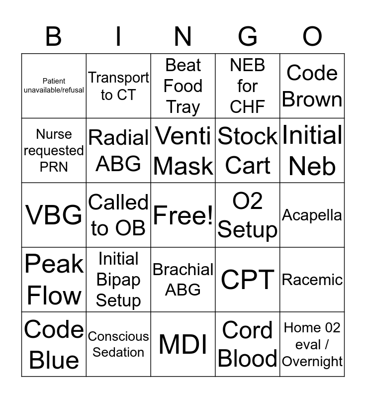 This bingo card has a free space and 29 words: Code Blue, Carboxy, Called to OB, Vent, Patient unavailable/refusal, Beat Food Tray, Radial ABG, Initial Bipap Setup, O2 Setup, Conscious Sedation, Acapella, Home 02 eval / Overnight, MDI, Cord Blood, Initial Neb, Code Box, Brachial ABG, Peak Flow, Code Brown, VBG, CPT, Rapid Response, Stock Cart, Nurse requested PRN, NEB for CHF, Transport to CT, Racemic, Venti Mask and NRB.