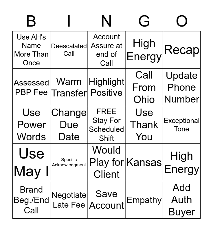 This bingo card has a free space and 24 words: Specific Acknowledgment, Negotiate Late Fee, Highlight Positive, Brand Beg./End Call, Recap, Use AH's Name More Than Once, Assessed PBP Fee, Deescalated Call, Use Thank You, Would Play for Client, Call From Ohio, Use Power Words, Kansas, High Energy, Warm Transfer, Empathy, Exceptional Tone, Account Assure at end of Call, Update Phone Number, Change Due Date, Add Auth Buyer, Use May I, High Energy and Save Account.