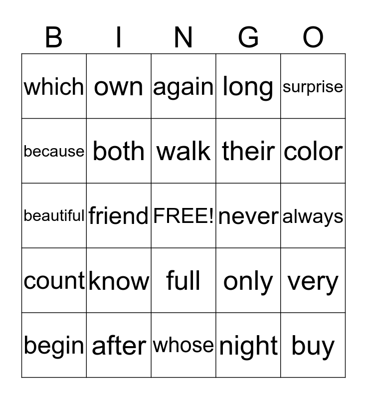This bingo card has a free space and 30 words: after, birthday, friend, myself, which, again, both, full, never, whose, always, buy, night, another, color, something, only, count, know, surprise, beautiful, laugh, own, their, because, long, very, begin, walk and pretty.