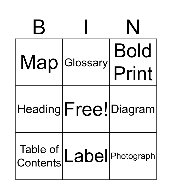 This bingo card has a free space and 13 words: Title, Title Page, Table of Contents, Glossary, Heading, Photograph, Illustration, Caption, Label, Map, Diagram, Bold Print and Italics.
