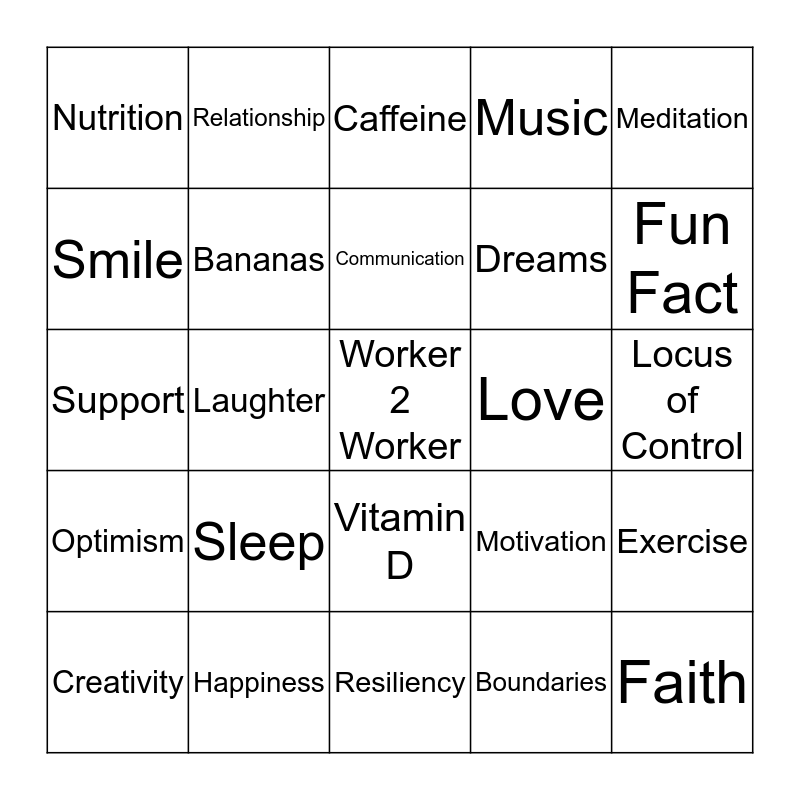 This bingo card has a free space and 24 words: Sleep, Happiness, Communication, Creativity, Meditation, Nutrition, Smile, Relationship, Love, Vitamin D, Dreams, Support, Motivation, Exercise, Bananas, Boundaries, Locus of Control, Caffeine, Fun Fact, Laughter, Faith, Optimism, Music and Resiliency.