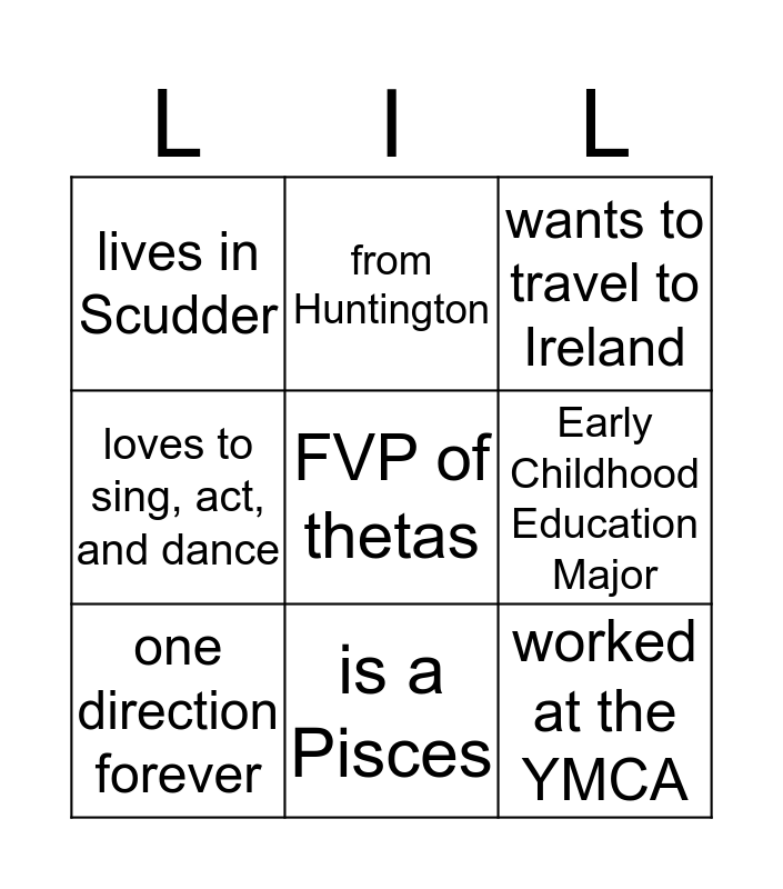 This bingo card has a free space and 8 words: Early Childhood Education Major, wants to travel to Ireland, from Huntington, one direction forever, lives in Scudder, worked at the YMCA, loves to sing, act, and dance and is a Pisces.