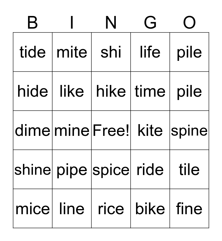 This bingo card has a free space and 29 words: mice, smile, mine, pine, tide, shi, like, pipe, kite, line, spine, fine, rice, bike, pile, mile, spice, shine, pile, dime, ride, lice, time, hide, life, mite, tile, hike and lime.