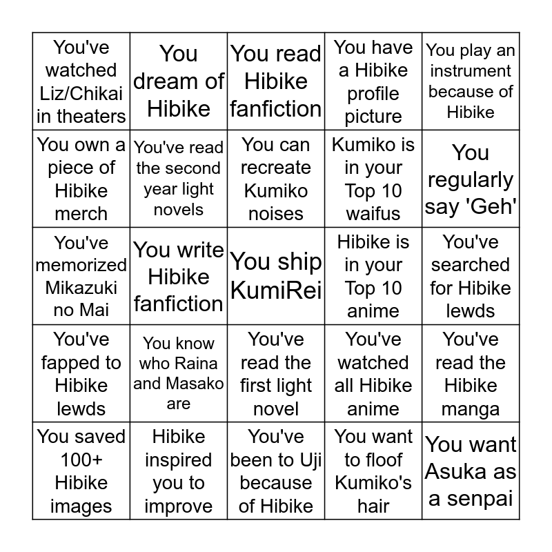 This bingo card has a free space and 24 words: You know who Raina and Masako are, Hibike inspired you to improve, You can recreate Kumiko noises, You saved 100+ Hibike images, You play an instrument because of Hibike, You've watched Liz/Chikai in theaters, You own a piece of Hibike merch, You dream of Hibike, Hibike is in your Top 10 anime, You've read the first light novel, Kumiko is in your Top 10 waifus, You've memorized Mikazuki no Mai, You've watched all Hibike anime, You've read the Hibike manga, You've read the second year light novels, You want to floof Kumiko's hair, You've searched for Hibike lewds, You read Hibike fanfiction, You regularly say 'Geh', You write Hibike fanfiction, You want Asuka as a senpai, You've fapped to Hibike lewds, You have a Hibike profile picture and You've been to Uji because of Hibike.