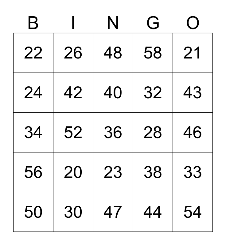 This bingo card has a free space and 24 words: 20, 30, 40, 50, 21, 22, 24, 26, 28, 23, 32, 34, 38, 33, 42, 44, 46, 48, 43, 52, 54, 56, 58 and 47.