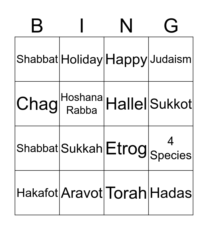 ⚠ This card has duplicate items: Lulav (2), Etrog (2), Holiday (2), Hallel (2), Musaf (2), Sukkah (2), Sukkot (2), Chol Hamoed (2), Chag (2), Hadas (2), 4 Species (2), Judaism (2), Hakafot (2), Torah (2), Aravot (2), Simchat Torah (2), Hoshana Rabba (2), Shabbat (2), Shake (2), Happy (2)