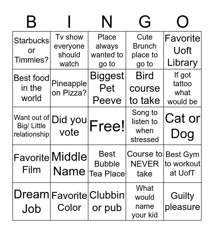 This bingo card has a free space and 24 words: Middle Name, Favorite Color, Biggest Pet Peeve, Dream Job, Favorite Uoft Library, Starbucks or Timmies?, Best food in the world, Tv show everyone should watch, Song to listen to when stressed, Best Bubble Tea Place, Bird course to take, Want out of Big/ Little relationship, Course to NEVER take, Best Gym to workout at UofT, Pineapple on Pizza?, What would name your kid, Cat or Dog, Place always wanted to go to, If got tattoo what would be, Did you vote, Guilty pleasure, Favorite Film, Cute Brunch place to go to and Clubbin or pub.