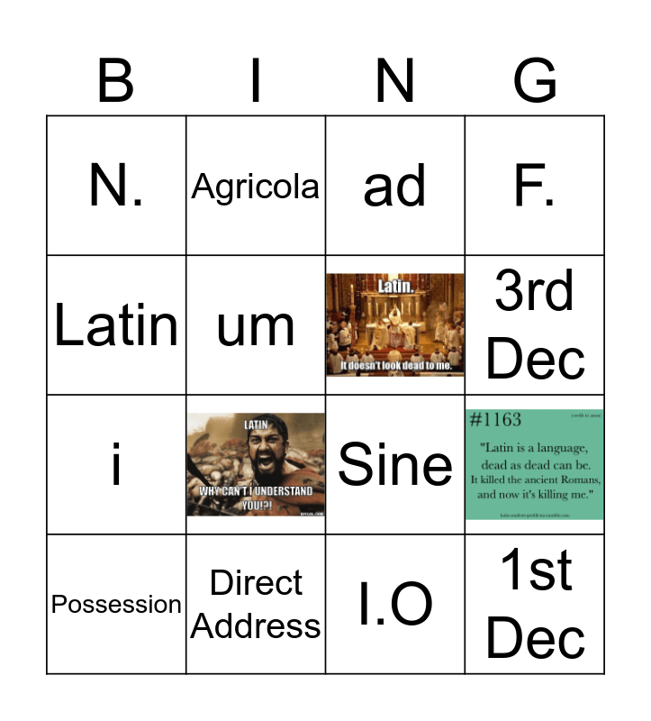 This bingo card has 4 images and 16 words: i, 2nd Dec, ad, 1st Dec, Possession, um, Canem, F., Latin, Agricola, I.O, 3rd Dec, N., Direct Address, Sine and M..