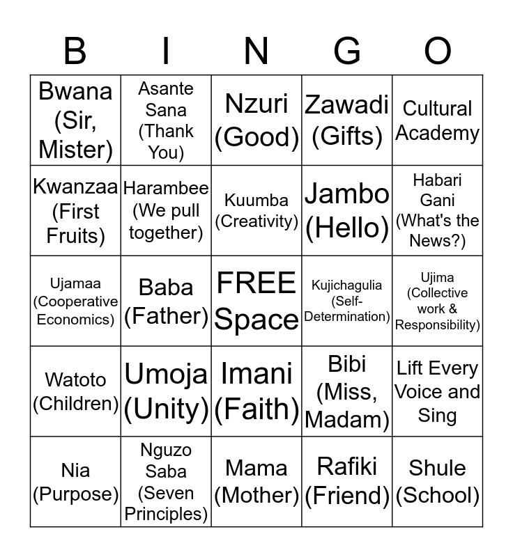 This bingo card has a free space and 24 words: Umoja (Unity), Nguzo Saba (Seven Principles), Kuumba (Creativity), Nia (Purpose), Cultural Academy, Bwana (Sir, Mister), Kwanzaa (First Fruits), Asante Sana (Thank You), Kujichagulia (Self-Determination), Imani (Faith), Jambo (Hello), Ujamaa (Cooperative Economics), Bibi (Miss, Madam), Lift Every Voice and Sing, Harambee (We pull together), Rafiki (Friend), Ujima (Collective work & Responsibility), Nzuri (Good), Habari Gani (What's the News?), Baba (Father), Shule (School), Watoto (Children), Zawadi (Gifts) and Mama (Mother).