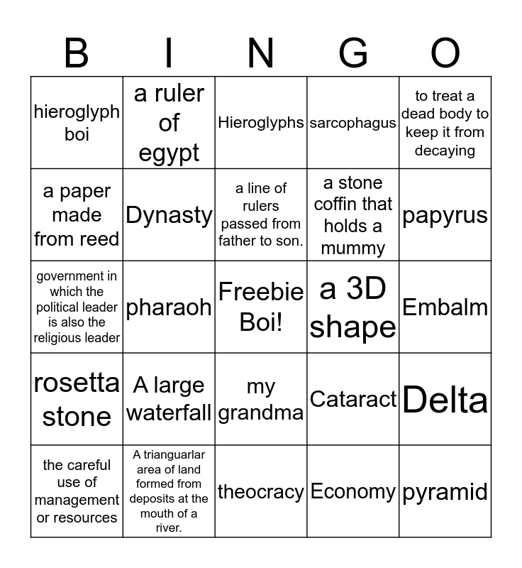 This bingo card has a free space and 24 words: A large waterfall, A trianguarlar area of land formed from deposits at the mouth of a river., a line of rulers passed from father to son., the careful use of management or resources, to treat a dead body to keep it from decaying, hieroglyph boi, a paper made from reed, a ruler of egypt, a 3D shape, my grandma, a stone coffin that holds a mummy, government in which the political leader is also the religious leader, Cataract, Delta, Dynasty, Economy, Embalm, Hieroglyphs, papyrus, pharaoh, pyramid, rosetta stone, sarcophagus and theocracy.