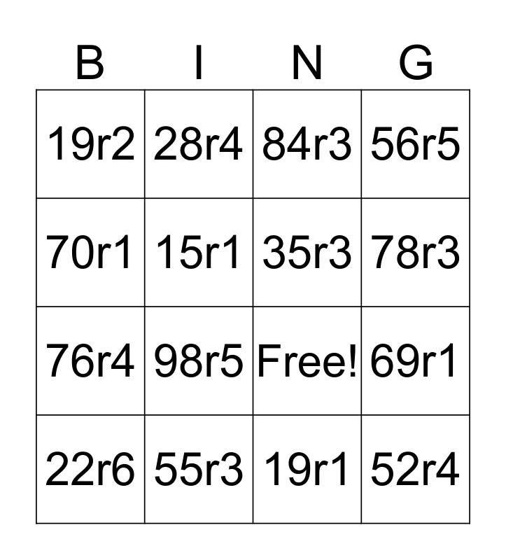 This bingo card has 16 words: 55r3, 69r1, 84r3, 19r2, 76r4, 28r4, Free!, 19r1, 70r1, 15r1, 22r6, 56r5, 98r5, 78r3, 35r3 and 52r4.