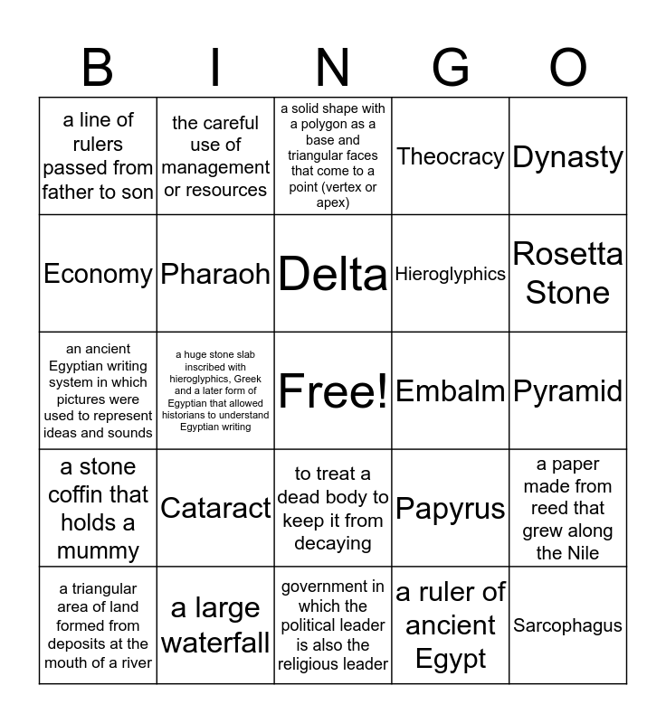 This bingo card has a free space and 24 words: Cataract, a large waterfall, Delta, a triangular area of land formed from deposits at the mouth of a river, Dynasty, a line of rulers passed from father to son, Economy, the careful use of management or resources, Embalm, to treat a dead body to keep it from decaying, Hieroglyphics, an ancient Egyptian writing system in which pictures were used to represent ideas and sounds, Papyrus, a paper made from reed that grew along the Nile, Pharaoh, a ruler of ancient Egypt, Pyramid, a solid shape with a polygon as a base and triangular faces that come to a point (vertex or apex), Rosetta Stone, a huge stone slab inscribed with hieroglyphics, Greek and a later form of Egyptian that allowed historians to understand Egyptian writing, Sarcophagus, a stone coffin that holds a mummy, Theocracy and government in which the political leader is also the religious leader.