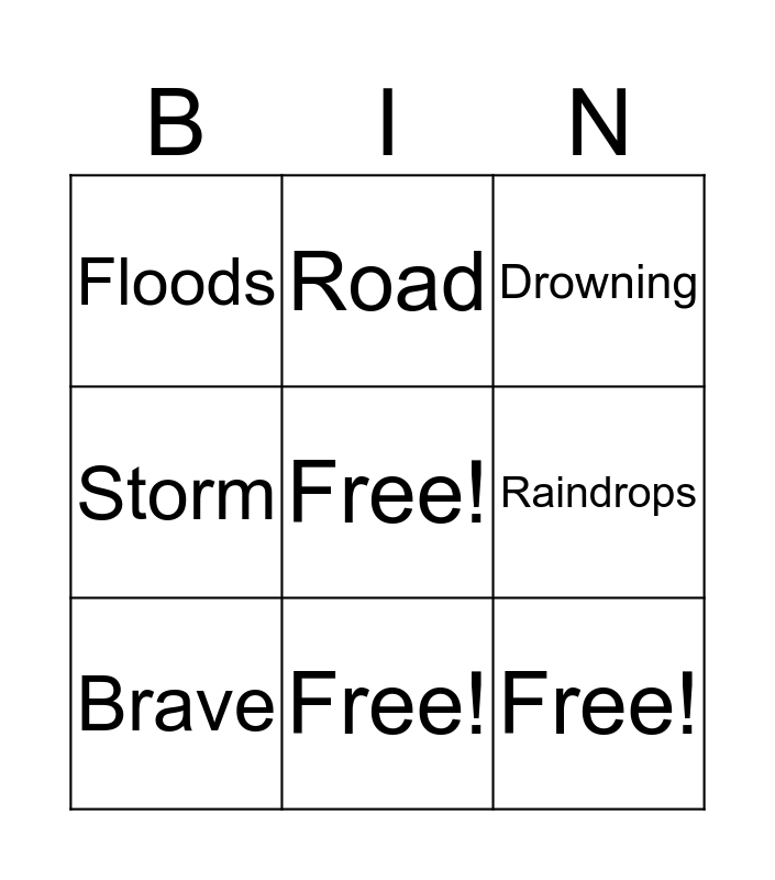 This bingo card has a free space and 8 words: Raindrops, Drowning, Road, Brave, Floods, Free!, Storm and Free!.