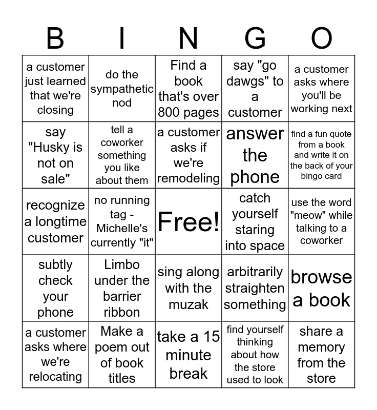 This bingo card has a free space and 24 words: Limbo under the barrier ribbon, Make a poem out of book titles, a customer asks if we're remodeling, a customer asks where we're relocating, a customer asks where you'll be working next, a customer just learned that we're closing, say "Husky is not on sale", do the sympathetic nod, catch yourself staring into space, sing along with the muzak, answer the phone, recognize a longtime customer, arbitrarily straighten something, browse a book, tell a coworker something you like about them, find yourself thinking about how the store used to look, use the word "meow" while talking to a coworker, Find a book that's over 800 pages, find a fun quote from a book and write it on the back of your bingo card, no running tag - Michelle's currently "it", share a memory from the store, subtly check your phone, say "go dawgs" to a customer and take a 15 minute break.