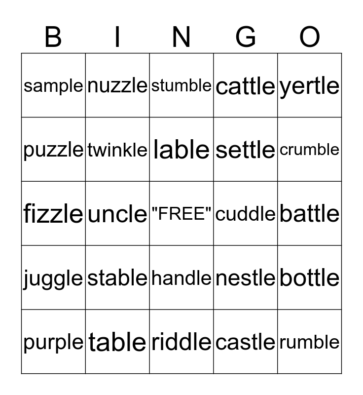 This bingo card has a free space and 24 words: stable, table, lable, purple, yertle, sample, puzzle, nuzzle, cuddle, handle, settle, fizzle, nestle, bottle, twinkle, castle, battle, stumble, crumble, uncle, rumble, juggle, cattle and riddle.