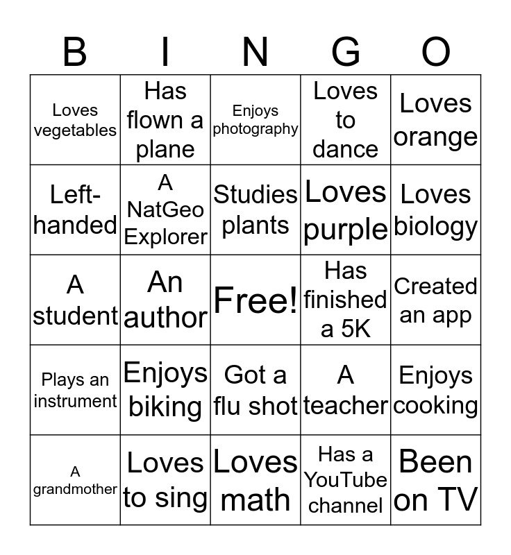 This bingo card has a free space and 24 words: Enjoys biking, Loves to sing, Studies plants, A grandmother, Loves orange, Loves vegetables, Left-handed, Has flown a plane, Has finished a 5K, Got a flu shot, Loves purple, A student, A teacher, Enjoys cooking, A NatGeo Explorer, Has a YouTube channel, Created an app, Enjoys photography, Loves biology, An author, Been on TV, Plays an instrument, Loves to dance and Loves math.