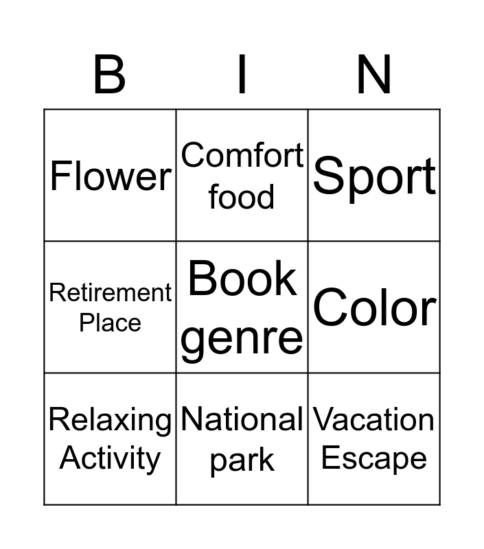 This bingo card has a free space and 8 words: Color, Sport, Comfort food, Relaxing Activity, Flower, Vacation Escape, Retirement Place and National park.