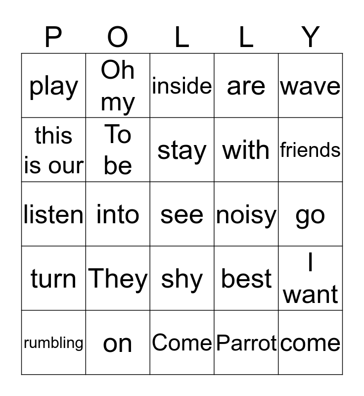 This bingo card has 25 words: They, Come, stay, rumbling, wave, play, this is our, Oh my, noisy, shy, with, listen, best, I want, To be, come, go, inside, friends, into, see, on, turn, are and Parrot.