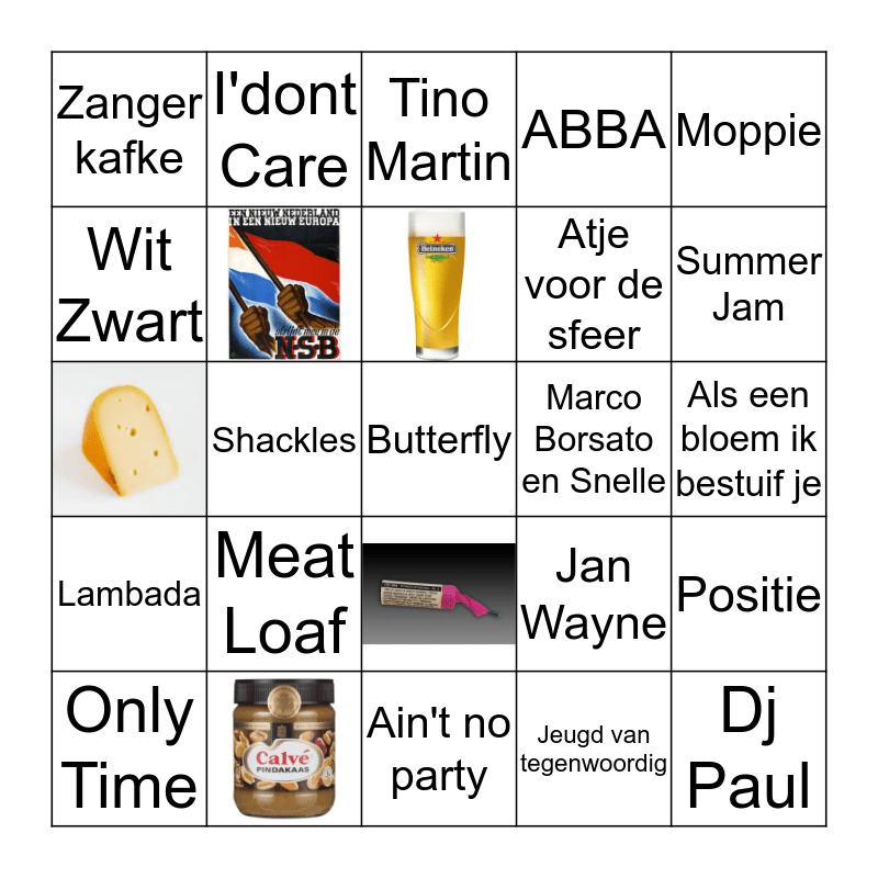 This bingo card has 7 images, a free space and 33 words: All around the world, Moppie, Lambada, Shackles, ABBA, Dj Paul, Als een bloem ik bestuif je, Marco Borsato en Snelle, Meat Loaf, Huisje op wielen, Zanger kafke, Kraantje pappie, Tino Martin, Positie, Jeugd van tegenwoordig, Atje voor de sfeer, Wit Zwart, Kygo, Hup, Paul Simon, Blue, Move ya body, Mariah Carey, Dolly Parton, Only Time, Toppertje, Jan Wayne, Summer Jam, Ain't no party, Year 3000, John West, I'dont Care and Tempted to touch.