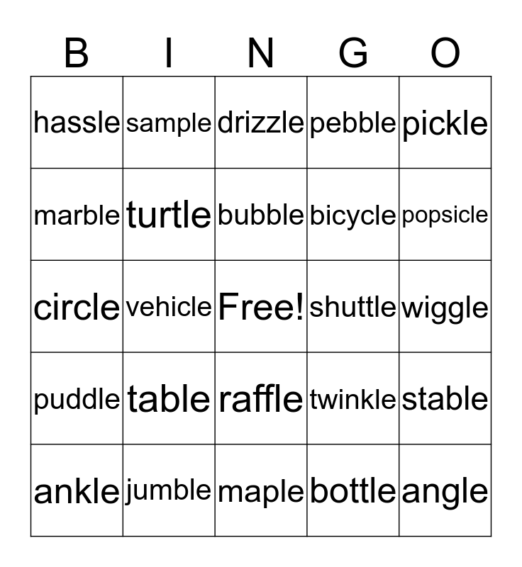 This bingo card has a free space and 24 words: ankle, table, bubble, bottle, pickle, hassle, sample, drizzle, shuttle, wiggle, circle, turtle, twinkle, stable, marble, jumble, maple, pebble, popsicle, puddle, vehicle, raffle, bicycle and angle.
