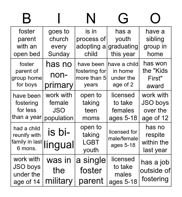 This bingo card has a free space and 24 words: is bi-lingual, was in the military, have been fostering for more than 5 years, work with JSO boys under the age of 14, have a sibling group in home, foster parent with an open bed, foster parent of group home for boys, goes to church every Sunday, licensed to take females ages 5-18, open to taking LGBT youth, have a child in home under the age of 2, have been fostering for less than a year, licensed for male/female ages 5-18, has no respite within the last year, has no non-primary, licensed to take males ages 5-18, work with JSO boys over the age of 12, is in process of adopting a child, has won the "Kids First" award, work with female JSO population, has a job outside of fostering, had a child reunify with family in last 6 mons., has a youth graduating this year and a single foster parent.