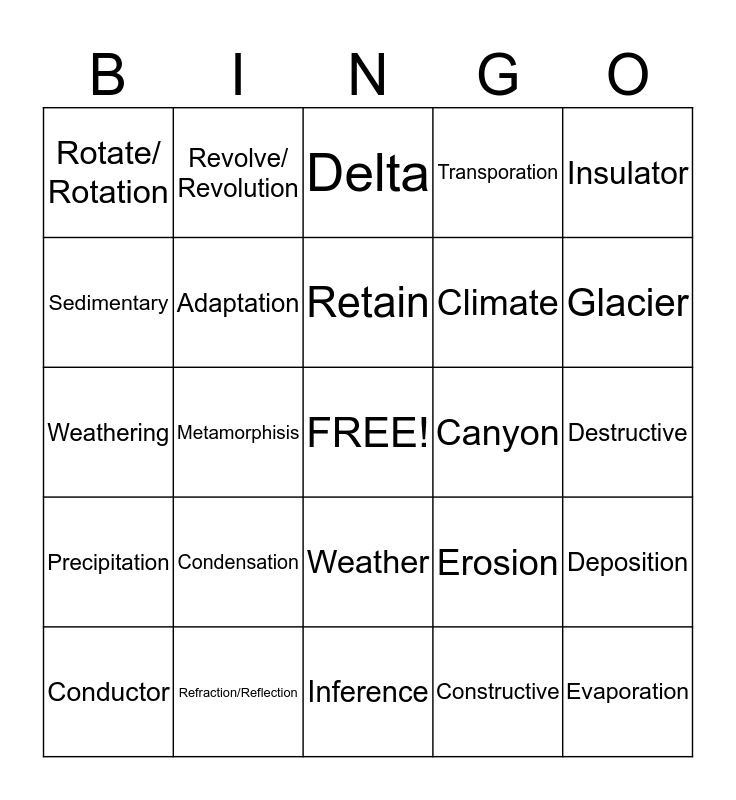 This bingo card has a free space and 24 words: Condensation, Refraction/Reflection, Retain, Conductor, Insulator, Rotate/ Rotation, Sedimentary, Revolve/ Revolution, Canyon, Weather, Climate, Weathering, Erosion, Deposition, Adaptation, Constructive, Destructive, Delta, Glacier, Metamorphisis, Evaporation, Precipitation, Transporation and Inference.