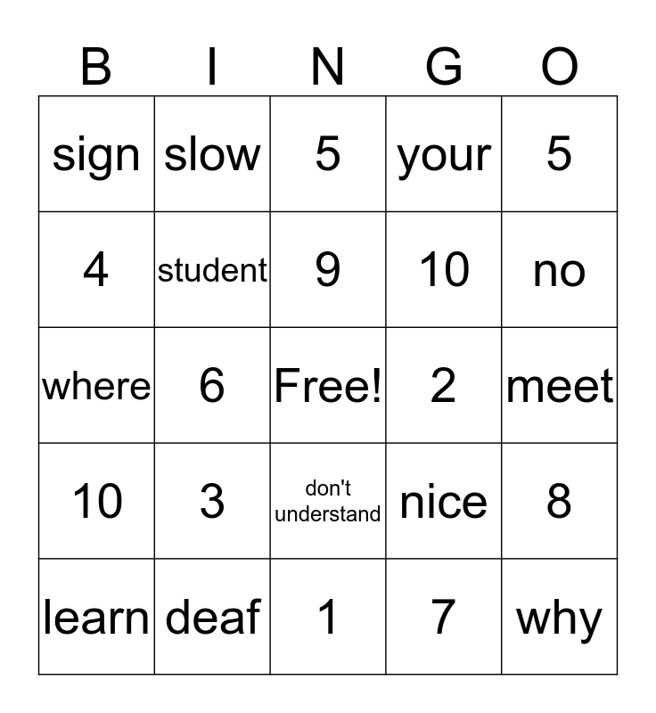 This bingo card has a free space and 24 words: 3, deaf, 9, learn, 5, sign, 4, slow, 2, don't understand, 10, where, nice, 8, student, 7, meet, 5, no, 6, why, 10, your and 1.