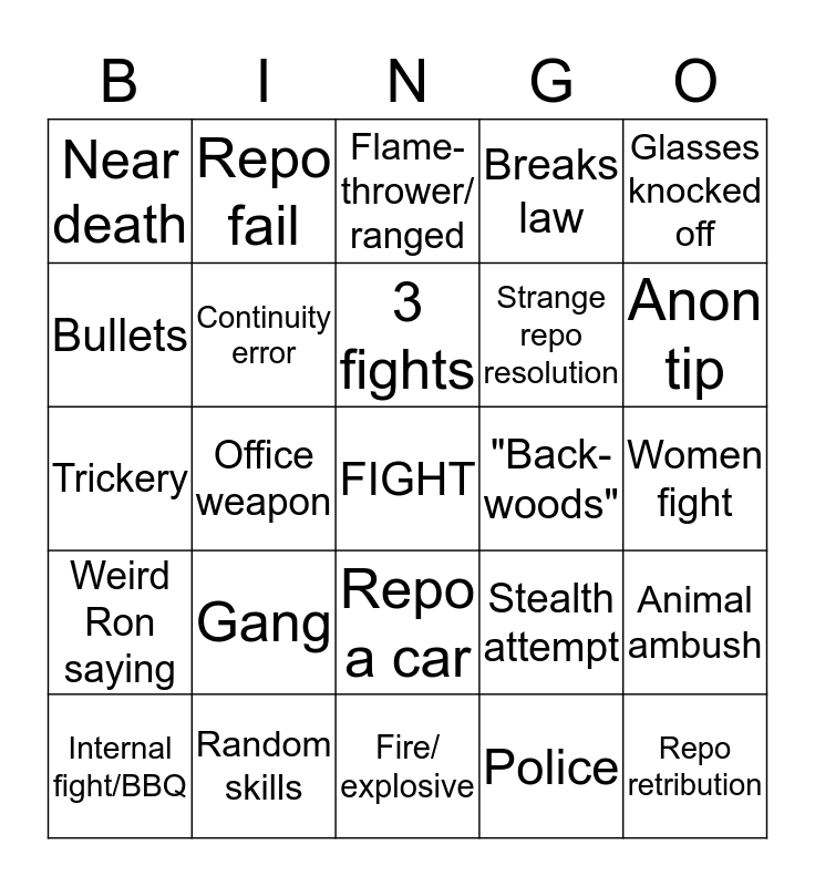 This bingo card has a free space and 29 words: Internal fight/BBQ, Bible jersey, Office weapon, Surprise repo, Near death, Flame-thrower/ ranged, Continuity error, Gang, "Back-woods", Random skills, Women fight, Repo retribution, Fire/ explosive, Police, Anon tip, Blood, Repo a car, Weird Ron saying, Glasses knocked off, Trickery, Stealth attempt, Other career path, Strange repo resolution, Bullets, Breaks law, Repo fail, Animal ambush, 3 fights and Stealth works.