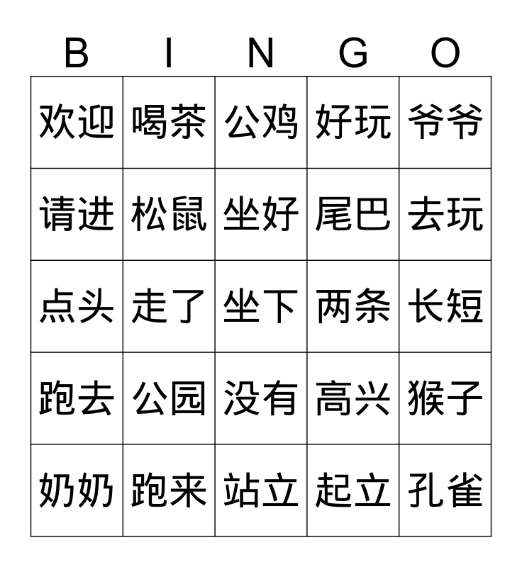 This bingo card has 25 words: 公园, 站立, 坐好, 奶奶, 爷爷, 欢迎, 请进, 喝茶, 两条, 没有, 尾巴, 点头, 高兴, 猴子, 松鼠, 孔雀, 长短, 公鸡, 去玩, 走了, 坐下, 跑来, 跑去, 好玩 and 起立.
