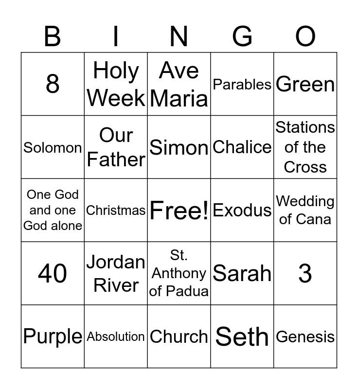This bingo card has a free space and 39 words: Matthias, Mother Theresa, Pope, Our Father, Purple, St. Anthony of Padua, Simon, Saul, Green, 40, Christmas, Parables, Genesis, Wedding of Cana, Exodus, Jordan River, 10, 8, Delilah, Sarah, Solomon, Church, Chalice, Stations of the Cross, Mary, Carpenter, Theology, Oil of Chrism, Original Sin, Holy Week, Confirmation, Baptism, Ave Maria, Absolution, Seth, 7, 3, One God and one God alone and Pontius Pilate.