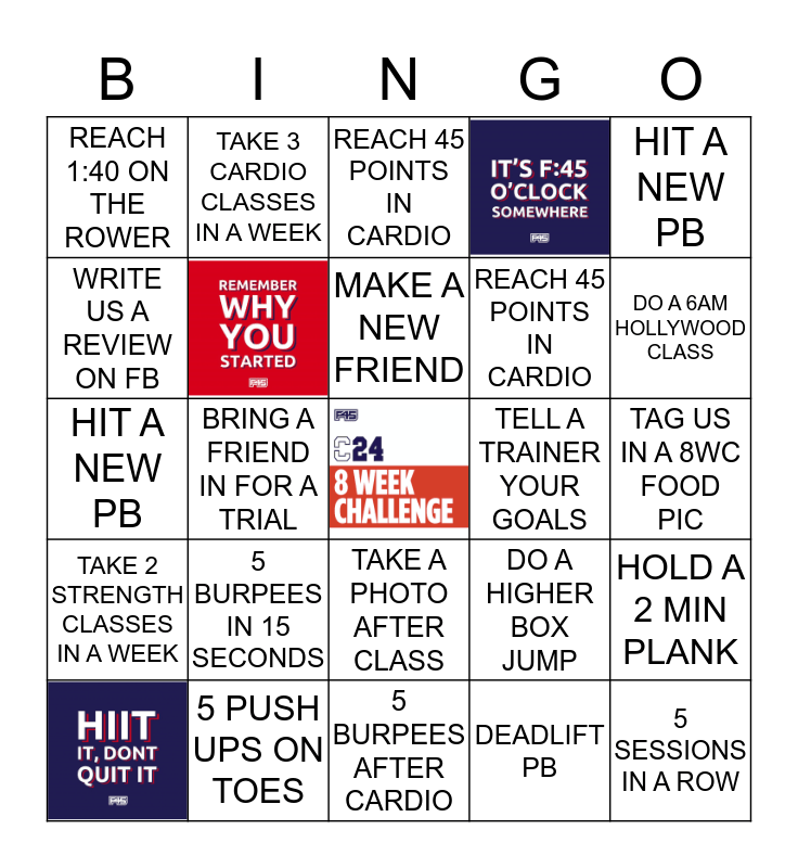 This bingo card has 3 images, a free space and 21 words: 5 BURPEES IN 15 SECONDS, 5 PUSH UPS ON TOES, MAKE A NEW FRIEND, HIT A NEW PB, REACH 1:40 ON THE ROWER, WRITE US A REVIEW ON FB, TAKE 3 CARDIO CLASSES IN A WEEK, TELL A TRAINER YOUR GOALS, TAKE A PHOTO AFTER CLASS, REACH 45 POINTS IN CARDIO, HIT A NEW PB, DO A HIGHER BOX JUMP, HOLD A 2 MIN PLANK, DEADLIFT PB, TAG US IN A 8WC FOOD PIC, REACH 45 POINTS IN CARDIO, DO A 6AM HOLLYWOOD CLASS, BRING A FRIEND IN FOR A TRIAL, 5 SESSIONS IN A ROW, TAKE 2 STRENGTH CLASSES IN A WEEK and 5 BURPEES AFTER CARDIO.