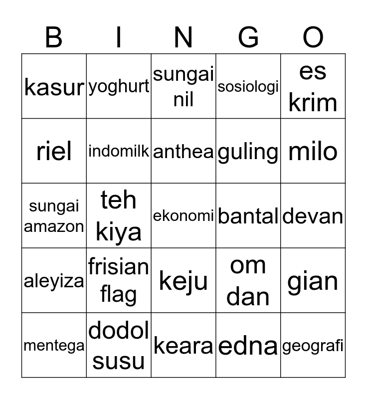 This bingo card has a free space and 24 words: frisian flag, dodol susu, anthea, mentega, es krim, kasur, riel, yoghurt, bantal, keju, guling, sungai amazon, om dan, gian, indomilk, edna, devan, sungai nil, milo, teh kiya, geografi, aleyiza, sosiologi and keara.