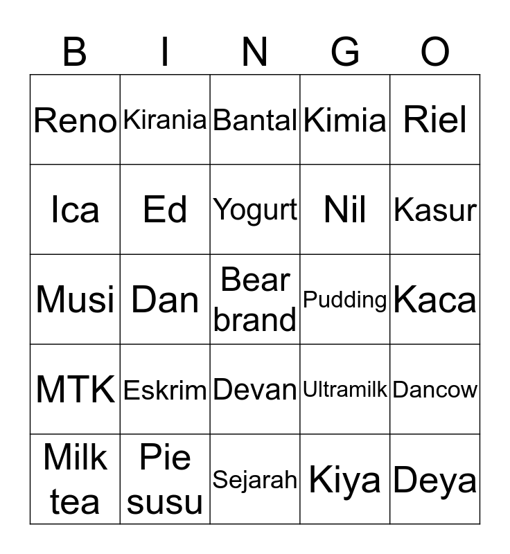 This bingo card has a free space and 24 words: Eskrim, Pie susu, Yogurt, Milk tea, Riel, Reno, Ica, Kirania, Pudding, Devan, Nil, Musi, Ultramilk, Dancow, Ed, Kiya, Kaca, Bantal, Kasur, Dan, Deya, MTK, Kimia and Sejarah.