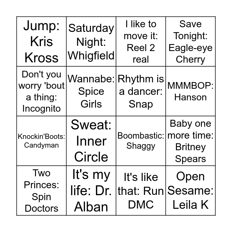 This bingo card has 16 words: It's my life: Dr. Alban, Baby one more time: Britney Spears, I like to move it: Reel 2 real, Jump: Kris Kross, Knockin'Boots: Candyman, Saturday Night: Whigfield, Boombastic: Shaggy, It's like that: Run DMC, Don't you worry 'bout a thing: Incognito, Wannabe: Spice Girls, Two Princes: Spin Doctors, Save Tonight: Eagle-eye Cherry, Sweat: Inner Circle, MMMBOP: Hanson, Rhythm is a dancer: Snap and Open Sesame: Leila K.