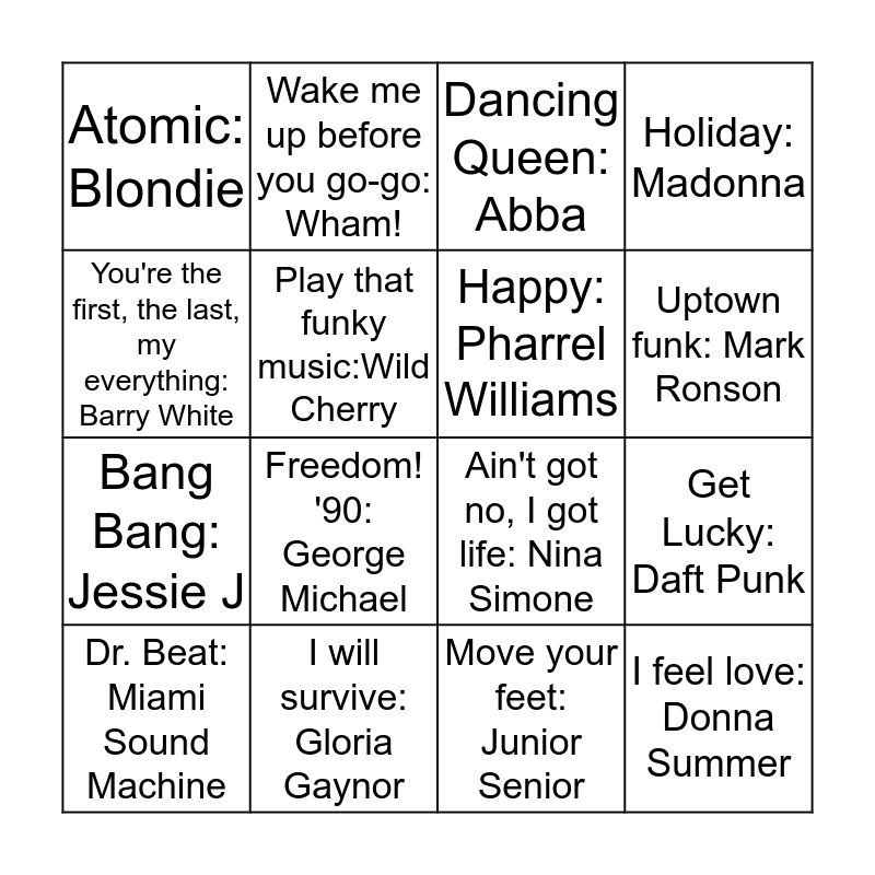 This bingo card has 16 words: I will survive: Gloria Gaynor, Get Lucky: Daft Punk, Dancing Queen: Abba, Atomic: Blondie, Bang Bang: Jessie J, Wake me up before you go-go: Wham!, Ain't got no, I got life: Nina Simone, Move your feet: Junior Senior, You're the first, the last, my everything: Barry White, Play that funky music:Wild Cherry, Dr. Beat: Miami Sound Machine, Holiday: Madonna, Freedom! '90: George Michael, Uptown funk: Mark Ronson, Happy: Pharrel Williams and I feel love: Donna Summer.