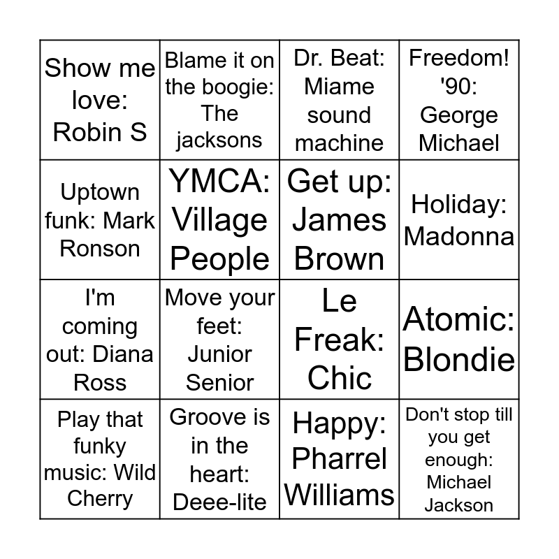 This bingo card has 16 words: Groove is in the heart: Deee-lite, Atomic: Blondie, Dr. Beat: Miame sound machine, Show me love: Robin S, I'm coming out: Diana Ross, Blame it on the boogie: The jacksons, Le Freak: Chic, Happy: Pharrel Williams, Uptown funk: Mark Ronson, YMCA: Village People, Play that funky music: Wild Cherry, Freedom! '90: George Michael, Move your feet: Junior Senior, Holiday: Madonna, Get up: James Brown and Don't stop till you get enough: Michael Jackson.