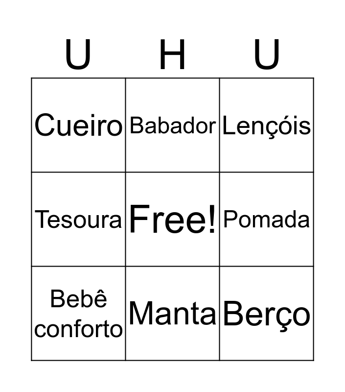 This bingo card has a free space and 24 words: Fraldas, Body, Meias, Luvas, Berço, Cueiro, Babador, Lençóis, Colônia, Chupeta, Mamadeira, Calça, Sapatinho, Trocador, Bebê conforto, Carrinho, Touca, Tesoura, Manta, Fralda de boca, Mosqueteiro, Hastes flexíveis, Pomada and Lenço umedecido.