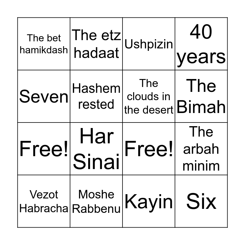 This bingo card has 20 words: The arbah minim, Five, Ushpizin, Beresheet, Vezot Habracha, Seven, Moshe Rabbenu, The bet hamikdash, Free!, The etz hadaat, Har Sinai, Free!, Hashem rested, Six, The clouds in the desert, Two and a half, The Bimah, 40 years, Kayin and Shmini Atzeret.