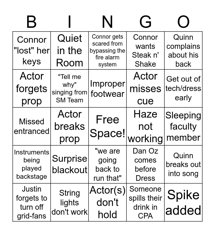 This bingo card has a free space and 39 words: USL door gets locked, Actor forgets weapon, Instrument being played while on hold, "Tell me why" singing from SM Team, Justin forgets to turn off grid-fans, "we are going back to run that", Improper footwear, Actor or Crew in way of boom, Quinn complains about his back, Instruments being played backstage, Actor breaks prop, Connor wants Steak n' Shake, Spike added, Sleeping faculty member, Haze not working, Surprise blackout, Actor disappears, Connor "lost" her keys, Lost coins, Dan Oz comes before Dress, Actor forgets prop, Actor(s) don't hold, Actor misses cue, Get out of tech/dress early, someone eating in CPA, Actor in sight-lines, Elena and Jeremy make a reference no one gets, Wrong scene shift, Improper drink container, Quiet in the Room, Actor/Crew doesn't sign in, Walt turns into Walter, Connor gets scared from bypassing the fire alarm system, String lights don't work, Someone spills their drink in CPA, Complaints about how cold it is in CPA, Quinn breaks out into song, Missed entranced and Scene shift doesn't happen.