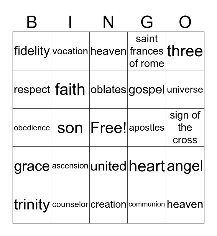 This bingo card has a free space and 29 words: trinity, father, son, holy spirit, fidelity, heaven, faith, ascension, apostles, counselor, sign of the cross, heaven, creation, communion, universe, distinct, united, grace, three, obedience, heart, kingdom, gospel, respect, saint frances of rome, vocation, angel, oblates and eternal.