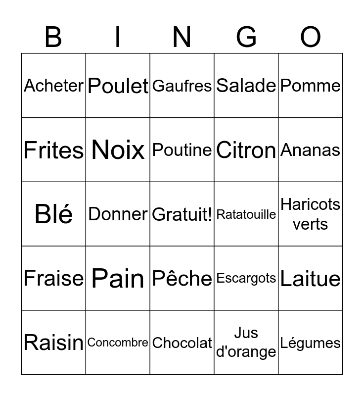This bingo card has a free space and 49 words: Fruits, Légumes, Poisson, Chocolat, Pain, Miel, Poulet, Steak, Frites, Hamburger, Noix, Salade, Laitue, Escargots, Baguette, Croissant, Poutine, Ratatouille, Manger, Pomme, Donner, Jus d'orange, Acheter, Citron, Épices, Ananas, Raisin, Bleuet, Pêche, Fraise, Framboise, Melon d'eau, Pamplemousee, Pizza, Concombre, Petit-pois, Poivron vert, Pomme de terre, Haricots verts, Pousser, Dans la terre, Sur la terre, Riz, Grains, Blé, Gaufres, Craquelins, Maïs soufflé and Céréales.