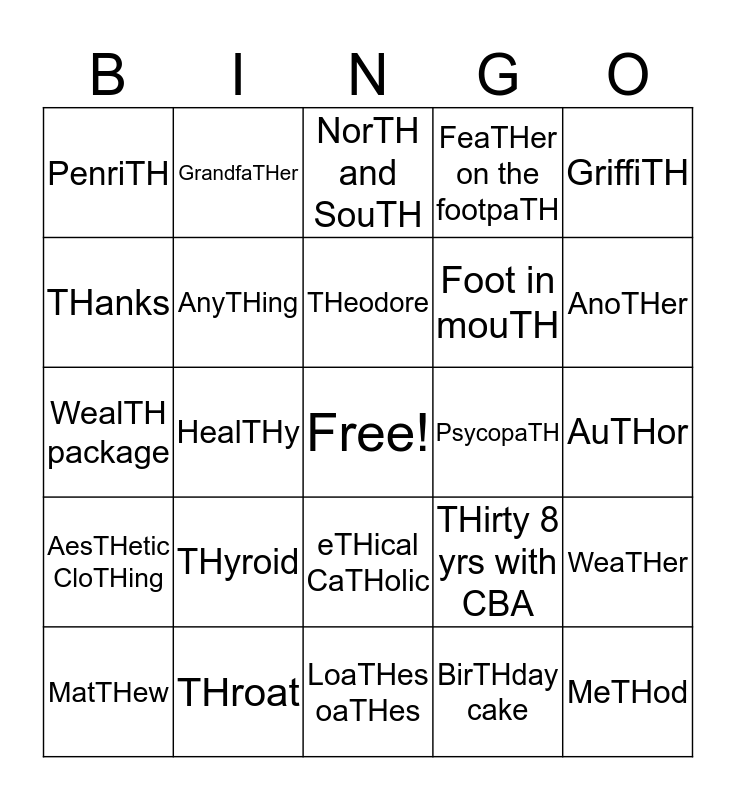 This bingo card has a free space and 24 words: THyroid, THroat, THeodore, MatTHew, GriffiTH, PenriTH, THanks, GrandfaTHer, PsycopaTH, eTHical CaTHolic, Foot in mouTH, WealTH package, THirty 8 yrs with CBA, WeaTHer, AnyTHing, BirTHday cake, AuTHor, NorTH and SouTH, AnoTHer, HealTHy, MeTHod, AesTHetic CloTHing, FeaTHer on the footpaTH and LoaTHes oaTHes.