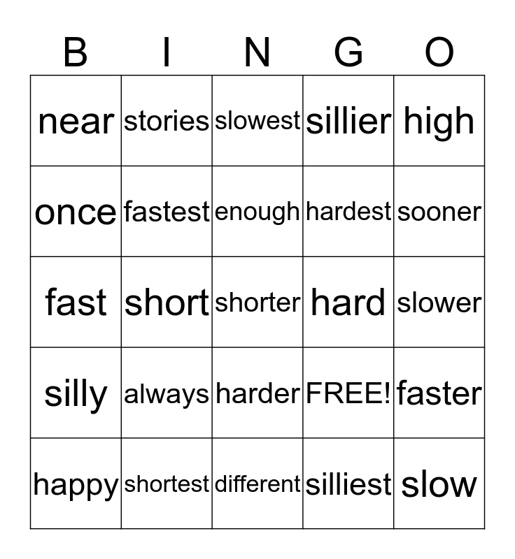This bingo card has 25 words: always, different, enough, happy, high, near, once, stories, hard, harder, hardest, fast, FREE!, faster, fastest, slow, slower, slowest, sooner, short, shorter, shortest, silly, sillier and silliest.