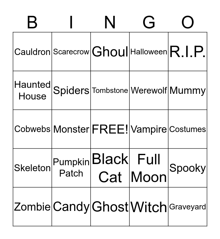 This bingo card has a free space and 29 words: Zombie, Goblin, Monster, Jack-o-lantern, Cauldron, Ghoul, Spiders, Pumpkin Patch, Vampire, Candy, Costumes, Graveyard, Ghost, Witch, Mummy, Bones, Black Cat, Skeleton, R.I.P., Cobwebs, Full Moon, Bat, Werewolf, Haunted House, Halloween, Scarecrow, Spooky, Tombstone and Frankenstein.