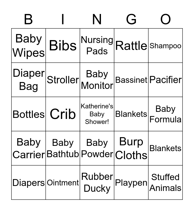 This bingo card has a free space and 24 words: Baby Bathtub, Ointment, Baby Monitor, Diapers, Shampoo, Baby Wipes, Diaper Bag, Bibs, Blankets, Baby Powder, Bassinet, Bottles, Burp Cloths, Blankets, Stroller, Playpen, Baby Formula, Nursing Pads, Pacifier, Crib, Stuffed Animals, Baby Carrier, Rattle and Rubber Ducky.