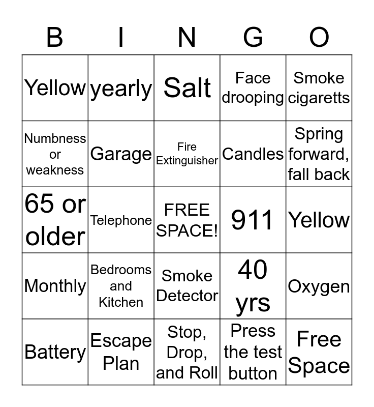 This bingo card has a free space and 24 words: Bedrooms and Kitchen, Escape Plan, Fire Extinguisher, Battery, Smoke cigaretts, Yellow, Numbness or weakness, yearly, 911, Smoke Detector, Candles, 65 or older, 40 yrs, Oxygen, Garage, Press the test button, Yellow, Salt, Spring forward, fall back, Telephone, Free Space, Monthly, Face drooping and Stop, Drop, and Roll.